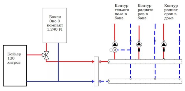 Простите за схему «на коленке», возможно её достаточно на сей момент. Принципиально-схема такова. Из насосов в системе-штатный в котле и насос ТП. Электрокотел из системы выведен во время работы газового котла. Обратные клапана стоят на выходе ГВС из газового котла в бойлер и в обратке от ТП и радиаторов( была проблема попадания теплоносителя в режиме ГВС в обратку радиаторов и ТП)