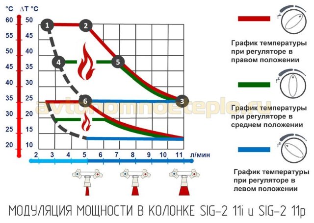 Рукоятка потока воды одновременно изменяет и подачу газа. А газ дополнительно регулируется отдельной рукояткой.