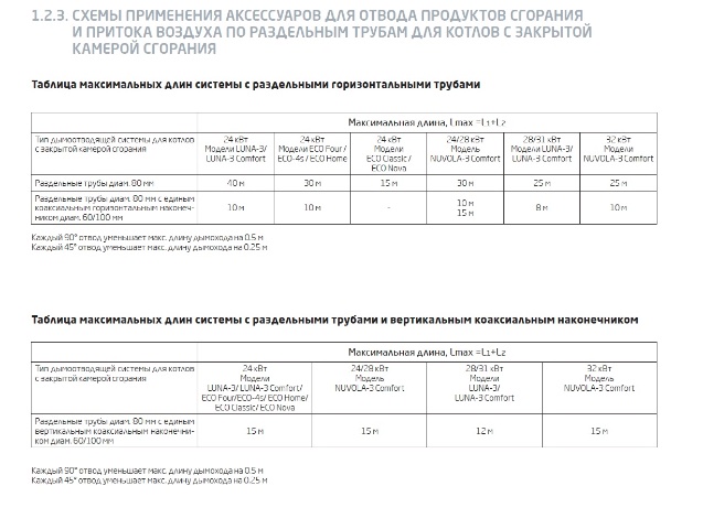 по длинам если труба 80 мм и наконечник 60/100 то для LUNA-3 - 8 метров общая длина (90гр - 0,5 м, 45гр - 0,25 м) кстати есть два разных вертикальных окончания, для низких температур и для обычных