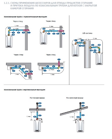 - тоже самое, что и при раздельных по компонентам, только в коаксиалах 1 труба, а вертикальных 2 трубы до соединителя. но выход из кровли и у раздельных и у коаксиала одинаковый.
