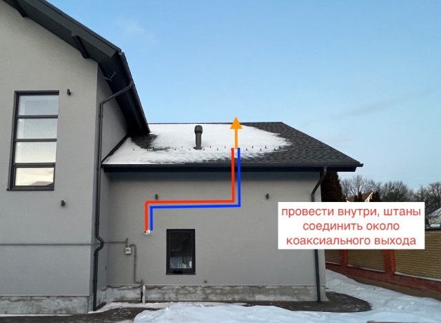 - тоже самое, что и при раздельных по компонентам, только в коаксиалах 1 труба, а вертикальных 2 трубы до соединителя. но выход из кровли и у раздельных и у коаксиала одинаковый.
