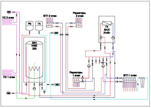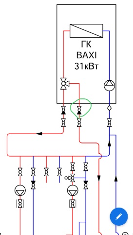Имеем систему с первично/вторичными кольцами. 2 контура с 8 радиаторами на первом и втором этаже и тёплый пол на первом и немного на втором этаже. Бойлер косвенного нагрева на 200 литров. Схему прилагаю. Проблема: при работе котла только в режиме системы отопления (радиаторы и ВТП) в режиме котла без бойлера заметил что греется обратка из бойлера - то есть вода горячая из первичного кольца перетекает в обратку бойлера и идет в обратном направлении в котел. В таком режиме бойлер нагрелся с 27 до 36 градусов за 6 часов. Такой эффект наблюдается при установленной заводской заглушки и сервопривода трехходового клапана. Почему?