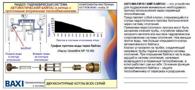 У двухконтурных байпасом является вторичный теплообменник, клапаном служит трехходовой клапан.