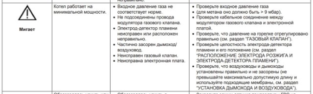 Мигает треугольник. -> Котел работает на минимальной мощности. Засорился дымоход/воздуховод или входное давление газа слишком низкое. -> Для сброса неисправности временно отключите запрос на производство тепла от системы отопления или ГВС. Если неисправность не устраняется, обратитесь в авторизованный сервисный центр.