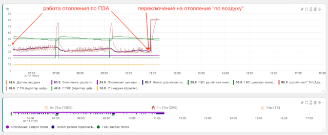 На графике видно, что запрос тепла был постоянный при ПЗА, но котёл выключался через несколько минут, не выходя на заданную по кривой температуру. После переключения на стандартный режим "по воздуху" без ПЗА нагнал ТН до 80гр, поработал какое-то время пока датчик воздуха не дошёл до 24.8 (при заданной 24.0) и ожидаемо отключился.