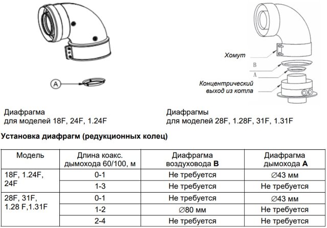 По диафрагме, я так понял что нужно ставить диафрагму воздуховода B, но в комплекте её не нашёл (возможно потерялась), да и в инструкции написано что она требуется только для котлов 31F и при диметре 80мм. Или я не правильно понял и нужно ставить диафрагму дымохода A?