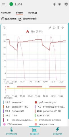 Я не говорил что перегревается котёл, я говорил что перегревается теплоноситель. По комнатному датчику котёл запускается на максимальную мощность, в моем случае это 70%, теплоноситель например нагревается до 70гр, а нужно 55гр., дом быстро прогрелся и котёл остановился. По погодному котёл нагревается теплоноситель до 55гр и далее поддерживает температуру согласно графика. По погодному система более инерционная. Во вложении два графика сравнения, и видно как по комнптному происходит нагрев и все отключения котла.kdme56 писал(а): 25 янв 2024, 20:27 Котёл не может перегреться, так как ему задан вручную предельный нагрев, да и зонт на страже.