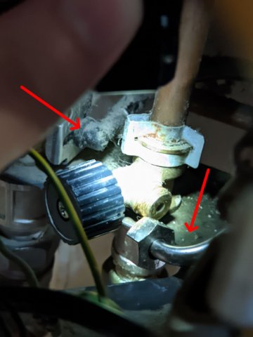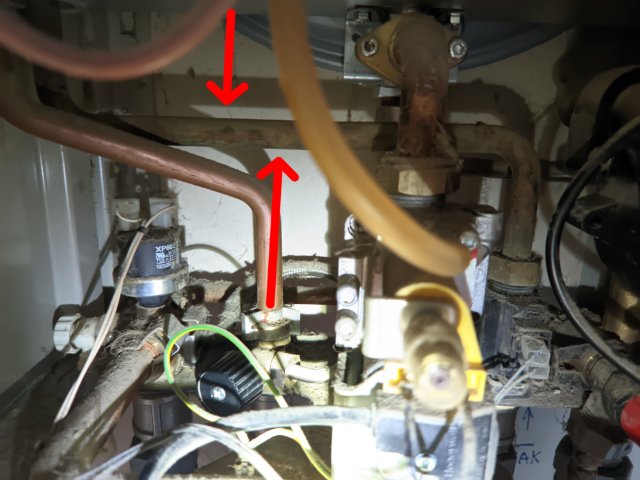 При включении крана подачи с котла на батареи отопления, сразу скакнуло давление с 0 до 1.5атм, при этом краны подачи воды на котел были перекрыты. На трубе подачи воды для ГВС, которая идет к теплообеннику были большие капли воды, на фото уже высохли. Это течь в теплообменнике? Видел эти капли еще при прошлом Т.О. котла.