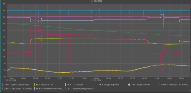 1) Вначале это работакло так, что температура теплоносителя менялась как-то сама в небольшом диапазоне, в зависиости от нагрузки видимо. Модуляцию колбасило даже на стабилизировавшейся системе от 40% до 0% на коротком промежутке времени.