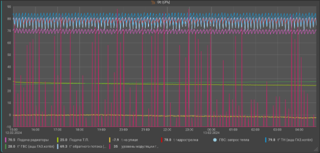 2. При этом Котел удивляет своими "незадокументированными способностями". При отсутствии запрос на тепло, Т в котловом контуре медленно снижается до... 25 град, потом на графике начинает расти до 35 град. И так рисует пилу 25-35 град. Циркуляция насоса в контуре радиаторов при отсутствии запроса на тепло останавливается (по настройкам насоса). При этом значение модуляции горелки "нуль", горелка ВЫКЛ. Откуда приток ТЕПЛА в контуре??? Предполагаю, что котел САМ поддерживает МИН температуру в котловом контуре 25град, но при этом на адаптер цифровой шины в ZONT информацию о работе горелки и модуляции не передает. Кто встречался с таким режимом разогрева "при нулевой модуляцией горелки". Что это за режим работы в описаниях нигде не нашел.