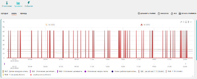 Скриншот график ошибок (аварий). В период появления аварий - на графике отображаются большой красной линией - обозначение - "отопление расчетная". Продолжительность аварии 2 минут.