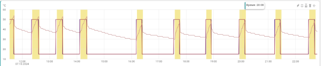 ПЗА расчитал 50 градусов, котел греет до 60 градусов, так как гистерезис стоит на 8 градусов, то следующее включение будет на 42 градусах.