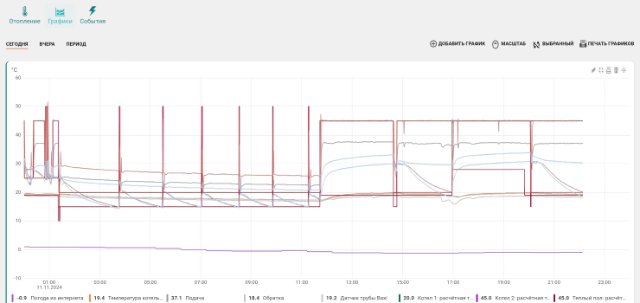 Вот, я даже на ночь психанул и выставил желаемую 10 градусов температуру в котельной, по моей логике все графики должны быть по нулям, а что это за пилы опять я никак не пойму