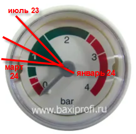 Котел установлен в июле 2023г, Baxi Luna 3 240FI. При установке котла давление на манометре было в верхней части сектора 1атм (большая зеленая область) (на рисунке во вложении отобразил). После включения отопления значения немного упали и в начале января 24 находились немного ниже центра области 1атм. Вчера обратил внимание что стрелка давления находится чуть выше начала области 1атм, а также при включении ГВС давление немного подымается (примерно до середины зеленой области), после отключения возвращается обратно. При включении работы отопления стрелка манометра не двигается (не проверял правда при полном отключении циркуляционного насоса котла, т.к. он работает постоянно). Визуальный осмотр системы коллекторов, радиаторов и прочих стыков, подтекания не обнаружил.
