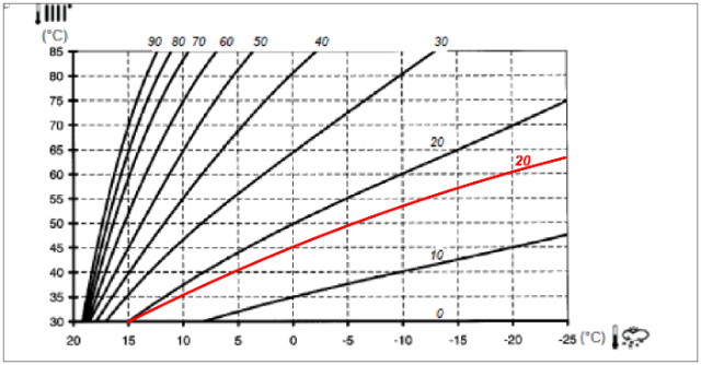 Сейчас быстро всё поймешь. Привычнее "плясать" от температуры воды на подаче котла. Теперь рисунок из инструкции используем для подбора кривой. Красная стрелка - температура которую хочется получить в СО, примерно 43 градуса (+ 0,5), а на улице 10 градусов (так твой нынешний уличный датчик котла видит, в котле показывает +10) - зеленая стрелка. Там где стрелки сошлись - искомая кривая = 30.