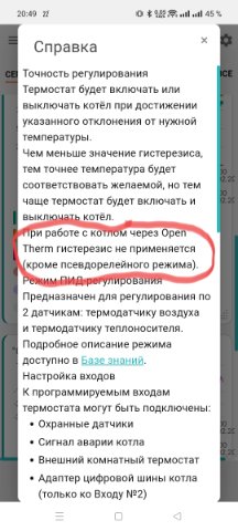 Да , согласен , в инструкции нечего не написано. Есть в самом Зонте - Описание --> Конфигурация (Самые популярные настройки для Вашего устройства) , так судя из описаний гистерезис поддерживает только в "Релейное управление котлом по воздуху " в других режимах гистерезис не упоминается.