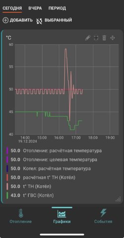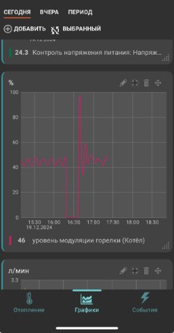 Котёл завёлся, начал работать и я уехал. Но работал он как-то странно, горелка практически всё время была отключена. В Воскресенье переписал сценарий, снизил температуру теплоносителя до 40 и теперь работает с короткими всплесками активности.