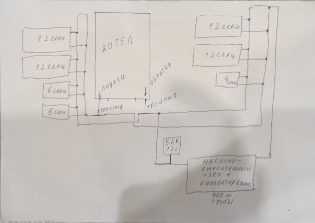 Здравствуйте, собираюсь сделать комбинированную систему отопления. Котел Baxi ЭКО 4s 24f будет стоять в кухне гостиной, от него будет идти два контура отопления с радиаторами через тройник один на 4 радиатора 2 по 12 сексиций, 2 по 6 секций, другой контур на 3 радиатора 2 по 12 секций, 1 на 4 секции. И хочу поставить во второй контур на обратку после всех радиаторов расширительный бак на 12литров, и насосносмесительный узел с коллектором на 6 контуров для теплого пола ( приблизительно 400м трубы 16*2). Подскажите возможно ли так сделать и будет ли система работать корректно?