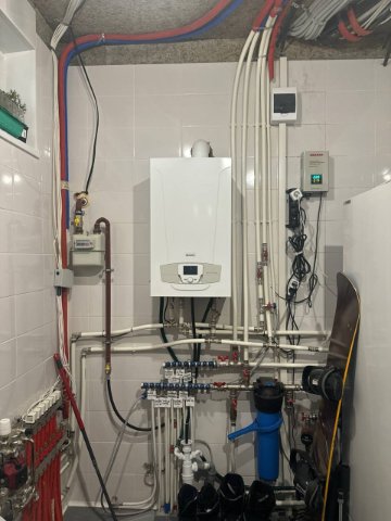 Итог замена труб в котельной, замена подмешивающих модулей коллекторов на насосные группы. Установка погодозависимого управления котлом и контуров отопления: 1-й этаж теплые полы, 2-й этаж теплые полы. 3-й этаж радиаторы. Нагрев бойлера гвс 300 л. Нагрев уличного бассейна.