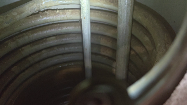 1. Так как чистил сам первый ра, то первой проблемой стал слив воды из бойлера. На указанный выше (см. фото выше) штуцер-елочку натянул шланг силиконовый диаметром 10 мм. Наверно, правильнее было бы 12 мм шланг, но какой купил, тем и пользовался. Надевался шланг туго, пришлось подогреть на огне и натянуть. Зато не соскакивал! Второй конец шланга опустил в канализацию - у меня за бойлером выведена труба 50 мм для аварийного сброса. Рифленая гайка открутилась от руки довольно легко. Но вода отказывалась стекать из бойлера даже при всех открытых кранах. Потом догадался открыть спускные краны на ГВС и циркуляции ГВС в цоколе дома. Помогло! Кстати, шланг длиной 3 м и им удобно контролировать уровень воды в бойлере, поднимая свободный конец повыше.