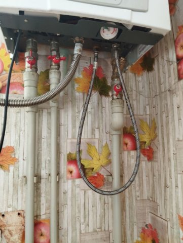 Сделано сейчас как на фото. Работает только контур отопления, второй не работает. Подача давления (воды) второй слева вход.