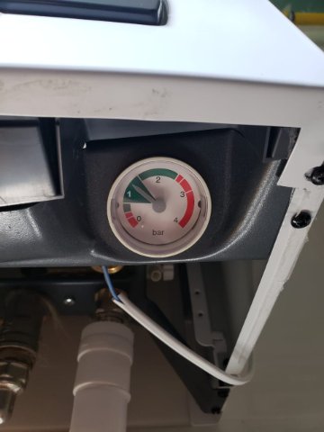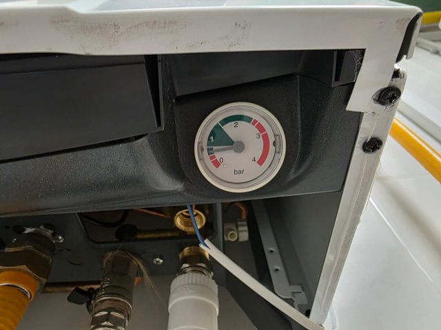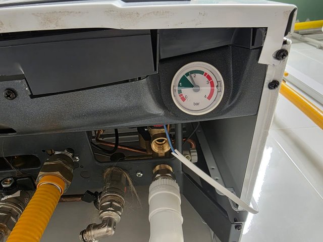 Три месяца назад была проведена ревизия системы отопления (добавлены 2 радиатора): теплоноситель слит, радиаторы продуты и система заполнена заново. Давление в расширительном баке было установлено примерно на уровне 1,2 бар. После заполнения системы отопления давление в холодном состоянии составило 1,7 бар, а при рабочей температуре +60°C достигало 2,4–2,5 бар.(если я правильно читаю значения на манометре, на всякий случай прикладываю фото). Незначительная протечка в одной из точек сохранилась.