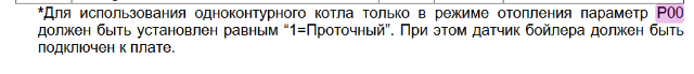 Параметр Р00 задает конфигурацию ГВС. Заводская установка 1 = проточный, 2= бойлер, 3=только отопление, 4= битермический.