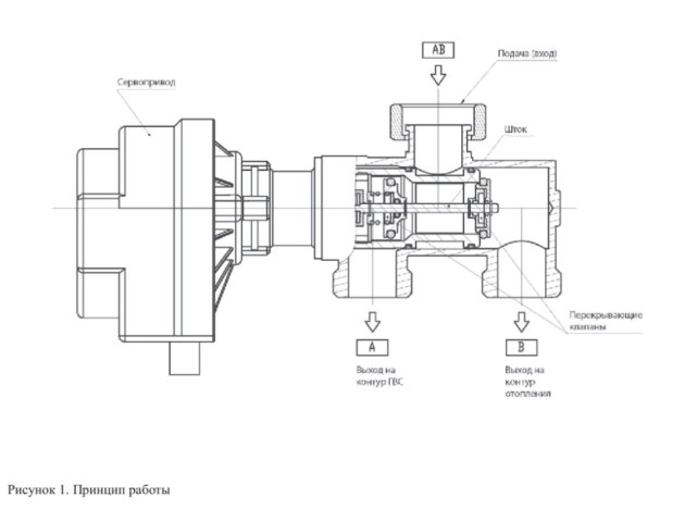 В моем понимании работать трехходовой должен так: три провода, один "0", две фазы - которые переключаются последовательно при смене режимов ГВС и Отопление. Мозги дают напряжение на один из контактов, срабатывает моторчик, диск в моторе делает оборот 90°, лапка контакта с напряжением прячется в выемку, контакт с напряжением размыкается. И дальше так стоит пока не придёт напряжение с другого контакта.