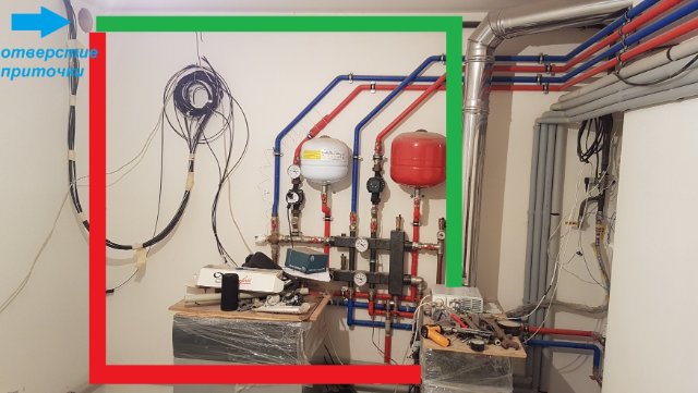 Решение проблемы решил реализовать с помощью забора воздуха с улицы. Просверлил отверстие в котельной под потолком (на улице оно получилось примерно на уровне 1 метра от земли, под навесом). Дальше планирую трубой для вентиляции 100мм, через фильтр, подвести воздух к котлу. На фото нарисовал два возможных варианта - зеленым по потолку и вниз, красным - сразу вниз и по полу. Первый вариант чисто технически реализовать проще, ничему не будет мешаться, а за котлом труба опустится хоть до самого пола.