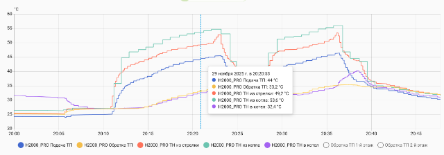 Также увеличил до 30 мин выбег насосов котлового и теплого пола, что позволяет за эти 30 минут держаться в пределах гестереза 2-х градусов.