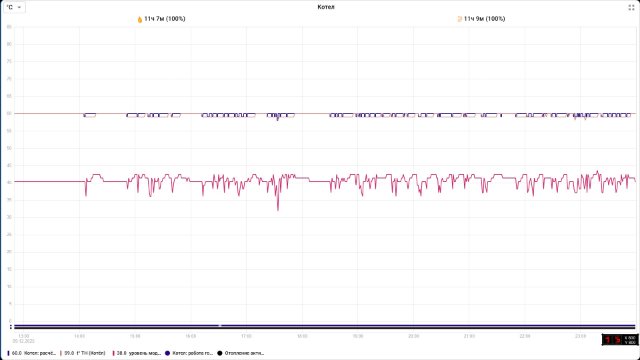 В сервисных настройках, активировал опцию "не снимать запрос тепла". После этого котёл перестал тактовать. Но теперь молотит без остановки. Режим работы 100%. График прилагаю.