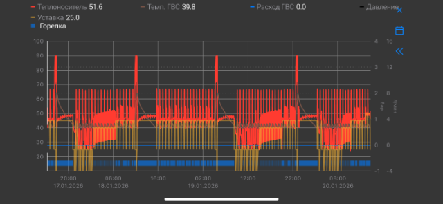 Подскажите, включил в настройках котла антилегионеллу на 66 градусов, вроде как должна была включиться в течении часа после подачи питания на котел и далее раз в неделю в то же время. Но я наблюдаю вот такой график, включалась 4 раза за последние 3 дня в случайное время. В чем может быть причина? Поддержка Эктоконтроля утверждает что они тут ни при чем, они не могут управлять этой функцией котла и не могут включать и выключать котел.