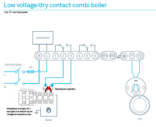 Ну ок, попросил подключить его хоть как то, тк в инструкции Nest gen 3 EU (EU значит Европейская версия с блоком HeatLink 220V) на стр. 21 есть заветная схема с названием Dry Contact, на что получил невнятный отказ (мол надо НАШЕ отечественное, ну типа ZONT), решил уже дальше не умничать, дал ему 1000 руб за вызов, перекрестил и отправил с богом на следующий вызов.