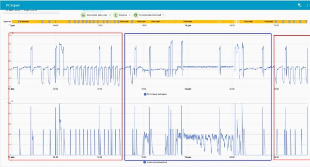 Сегодня без всякого вмешательства котел снова переходит в изначальный режим со скачками. На картинке обвел эти зоны синим и красным.