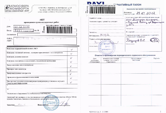 Сергиевопосадское представительство ООО «Атмосфера комфорта» устанавливало мне одноконтурный газовый котел BAXI в загородном доме два года назад. Представитель фирмы Ходырев Владимир Сергеевич предъявил удостоверение BAXI от 26.06.2012 г. и свидетельство СРО Сфера-А о допуске к работам. Акт проведения пуско-наладочных работ и гарантийные талоны были заполнены от ООО «Атмосфера комфорта, а договор и приходный ордер были выданы от ИЧП Орлов Андрей Львович (который является учредителем и директором Атмосферы комфорта). Кассовый чек не был выдан. Судя по трудностям при монтаже, работник фирмы видел данный котел первый раз жизни. Установка настенного котла и подключение его к готовой системе отопления и установленному бойлеру заняла два дня. Несмотря на мое требование поставить механический фильтр на обратку котла, он его не поставил. Промывка системы отопления так же не была сделана. Эти требования указаны в инструкции к котлу. Так же не был предусмотрен кран слива воды из бойлера. На требование поставить кран было сказано, что можно открутить американку и слить воду на пол (200 литров!). С трудом мне удалось заставить сделать этот кран. После пуска котла я проверял его настройки и выяснил, что не переключен тип газа. Так же не был выведен в дренаж слив предохранительного клапана котла. Я даже не мог предположить, что я должен буду контролировать весь процесс установки котла, пригласив для этого фирму, имеющую все допуски.