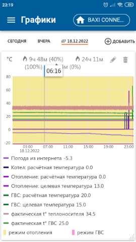 Попробовал с телефона выключить котел. Судя по меню он выключен, но по графику ни чего не поменялось кроме того что прервались два графика Отопление и ГВС: целевая температура. Но сам котел продолжает греть воду 30-35гр для отопления.