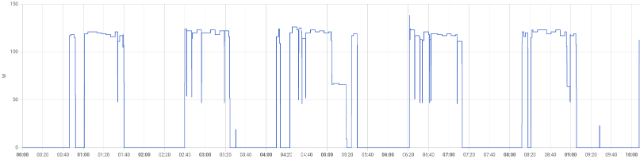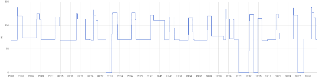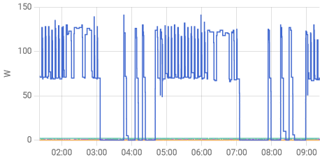 На графике мощность потребляемая котлом при отоплении. Верхняя граница работа вентилятора, горелки и насоса. (111 до 141 ватта). Нижнаяя (68-74 ватта) работа только насоса.