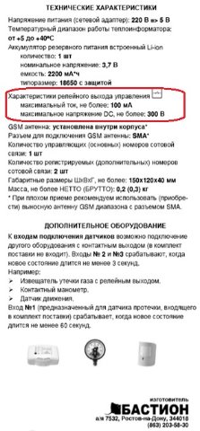 Сейчас посмотрел из наличия. Лежит Teplocom GSM выпуска октября прошлого года. В инструкции 100мА и 100В.