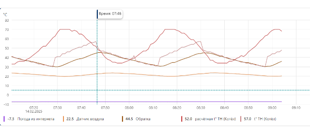 Всем привет. В общем все нормально, но есть одно но. Котел включается в заданное время как стоит в параметре Р17, хотя запроса на тело нет. Как будто это продувка. В графике не отображаются эти пуски, продолжительностью не более 5 секунд, но бывает 15-20 сек. это включение видно по температуре теплоносителя. С чем это связано? Графики приложил.