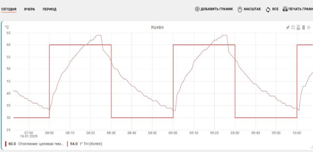 В настройках контроллера составил расписание: в первые полчаса каждого часа контроль по теплоносителю в 60 градусом,