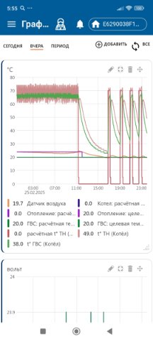 P.S. Да и при работе на 24 градуса видно, что котел работает на более 70 градусов теплоносителя, и все равно не может поддерживать 24 градуса по воздуху, температура падает, вот он и не снимает запрос на отопление.