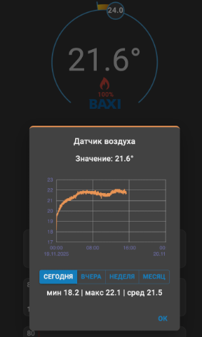 Вроде все работает, но не очень понятно для меня. Ребята с Baxi коннект не сталкивались. Вот на скрине видно, что стоит 24 градуса, но по графику температура просто плавала в пределах 22 градусов. Гистерезис выставил 0,5 градуса в программе.