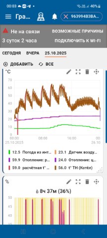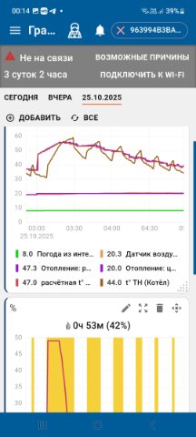 А температура носителя то при этом какая была? Если тоже поднималась до 80, то, наверное, в СО копать надо, а вот если не поднималась до максимума, тогда уже котел-connect цепочку исследуй с датчиком по воздуху.Georgii писал(а): 19 ноя 2025, 17:28 Основная проблема сейчас в том, что позавчера котел прогрел помещение до 24 градусов,я потом перевел в экономный режим, температура упала. Вчера выставил опять 24, и вот со вчерашнего вечера котел нагнал еле-еле 21-22, причем ставил температуру и 35, разницы нет. Поеду буду разбираться, как бы там что у меня не сломалось