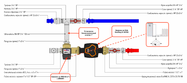 Изначально по проекту смесительный узел ТП состоял из термостатического клапана ESBA VTA572, но то ли монтажники его поломали, толи брак, но клапан "залипал", поэтому его заменил на 3-х ходовой дополнил сервоприводом ARA661, на обратку поставил балансировочный клапан и насос помощнее поставил Zota EcoRing IV 25/100 (схема во вложении).