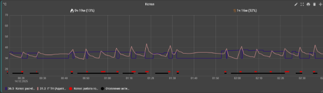 Ну это правильнее смотреть совместно с целевой и фактической на датчике воздуха. Поскольку даже если он догрел теплоноситель, а целевой по воздуху нет, то он и не выключится, пока не догреет помещение.Ragers писал(а): 15 дек 2025, 21:15 Работа котла регулируется по воздуху, да. График с теплоносителем, потому что наглядно видно как он быстро нагревается и остывает тоже.