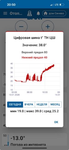 Поменял настройки, понаблюдал в течение 3 часов: модуляция все время 83% без колебаний. Температура ТН поднимается с 33 до 39, далее снижается до 36, далее - до 39 снова и так по кругу. За время наблюдения за 40 гр не перевалила и похоже, что не перевалит. Как я уже говорил, я до этого ставил регулировки по ТН и также смог поднять только до 38 за целую ночь.Bahus писал(а): Вчера, 17:55 Попробуйте сменить в режиме "по воздуху" на "по теплоносителю" и выставьте 50 (ну и гистерезис градусов 5 туда-сюда). Без ПЗА.