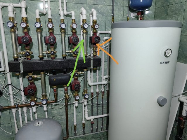 На фото оранжевая стрелка - насос подающий теплоноситель в бойлер. Зеленая - обратка. Так же возможно будет полезна доп информация - когда всю систему устанавливали, сказали, что котел слишком мощный для данного дома и якобы каким то образом сделали так, что он работает на 50% мощности(при этом работают обе горелки). Могло это как то "поломать" его алгоритмы работы ? Такое ощущение, что при работе на отопление все штатно, а на прогреве в режиме легионеллы у него впринципе нет отключения пока он не увидит нужную температуру в бойлере, хотя как я понимаю весь смысл алгоритмов которые должны быть - если он за цикл не может прогреть бойлер, он должен отключиться при достижении 85 градусов, подождать скажем остывания до 75-80 и опять включиться, но этого не происходит..