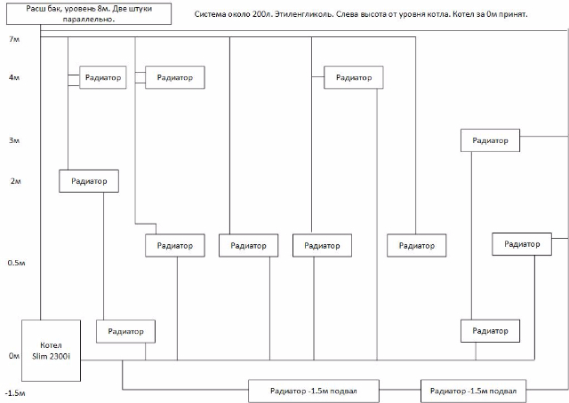 В доме изначально от котла труба подачи поднимается на уровень второго этажа и оттуда уже расходится по комнатам. До этой точки от уровня котла не менее 7ми метров и того же числа углов и поворотов. В системе порядка 200л этиленгликоля или теплого дома.
