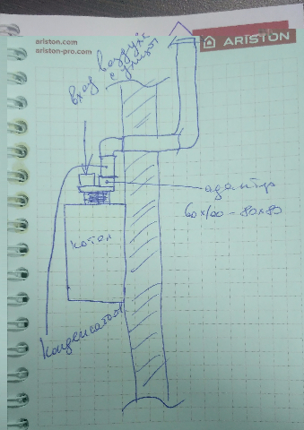 весьма наглядно, попробуем так, спасибоfaxer44 писал(а): Ну если смотреть по рисунку (условно), то не станет там у вас горизонтальный, места не хватит. Ибо сначала пойдет адаптер 60*100-80*80, затем только угол 90 градусов и потом выход в стену. Как вариант, ставить адаптер, затем вертикальный конденсатоотводчик, и только потом угол в стену. Если я правильно понял рисунок.