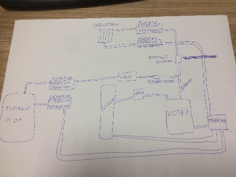 Нет у котла раздельной подачи на бойлер и на отопление. Один там патрубок. Так что схема ваша ни разу не информативная.ОлегDOX писал(а): Один выход это подача на бойлер, второй выход подача на отопление и один вход на обратку.